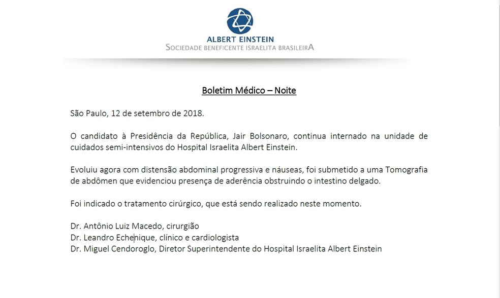 O candidato à Presidência Jair Bolsonaro (PSL) voltou na noite desta quarta-feira, 12, para o centro cirúrgico do hospital Albert Einstein, em São Paulo, onde passa por um procedimento de emergência. A assessoria de imprensa do hospital confirmou a realização da cirurgia. Em boletim médico divulgado às 23 horas, a entidade explica que a decisão pela intervenção ocorreu após Bolsonaro apresentar distensão (inchaço) abdominal progressiva e náuseas.